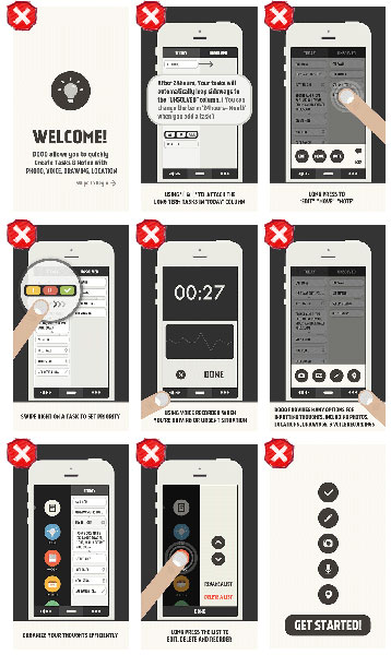 我們知道一圖勝千言的道理,雖然指導頁并不需要繁雜的圖片信息,但為了明了的傳達并解釋一些信息的時候需要較小的圖標圖像來展示,這時候要配合少量文字才能讓用戶有種頓悟的感覺。甚至在很多APP設計中僅僅使用圖標展示的做法,這種做法也是便于用戶清晰的讀取信息。
