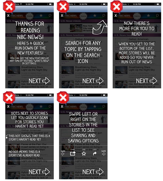 雖然指導頁用來幫助用戶了解一個APP,但是并不需要把過多的信息放進指導頁,可以放APP最有特色的特征來吸引用戶使用,更多的讓用戶自己逐步深入的去了解APP。