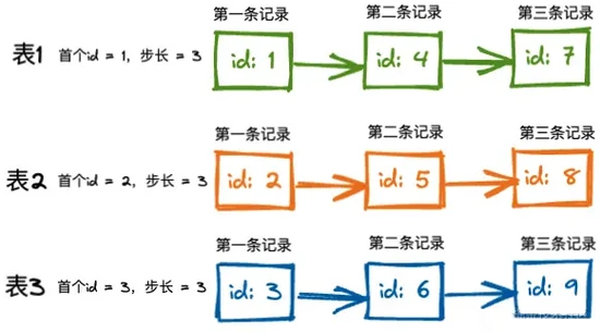 如上圖,每個表都有 不同的起始id和相同的步長 ,這就能保證業(yè)務記錄Id的唯一性。