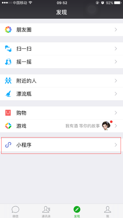 5、退出上面這個頁面,點開你的微信第三頁面“發現”,你會發現,再出現面出現了小程序的入口。