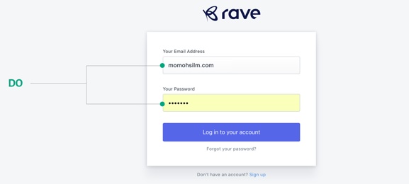 △ Flutterwave’s Rave的登錄頁面,輸入?yún)^(qū)域的尺寸與預期的輸入字段的長度比例一致