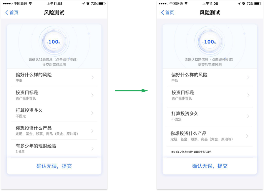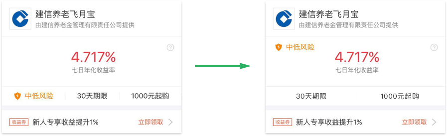 由于中低風險用橙色表示,第一眼會誤以為“中低風險”、“30天期限”和“1000元起購”是可點擊切換的TAB,而這里“30天期限”和“1000元起購”僅是文字提示。