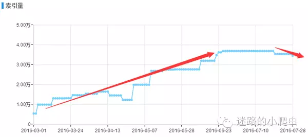 如上圖小編是今年三月份開始接手的這個網站項目,當時并沒有通過逆向思維去解決網站存在的收錄問題,只是經驗性的簡單分析了一下網站的日志,在站長后臺增加了sitemap推送和在服務器上部署了主動推送功能,短時間內的確效果明顯,該頻道的頁面收錄呈現良好的上升趨勢,可是通過圖表可以看出,收錄量在達到6月份的時候一直到7月份中旬沒有進行任何明顯的變化,從7月中旬之后小編當時就有一種危機感,職業上的直覺告訴我,接下來一段時間該頻道的收錄會呈現大幅下降的趨勢,結果果不其然,如下圖: