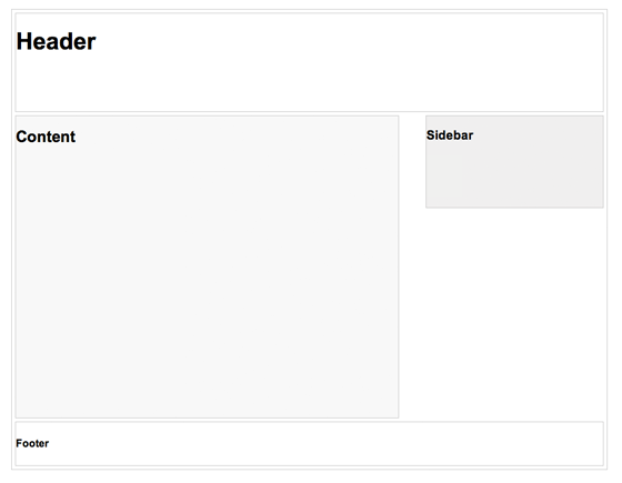 在這個例子中,頁面布局包括 Header, Content, Sidebar和Footer. Header固定高度為180px, Content寬600px, Sidebar寬300px。