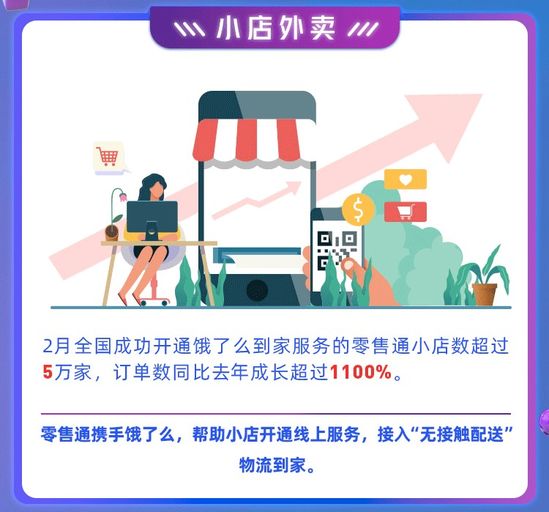 疫情倒逼商業創新。2月,全國成功開通餓了么到家服務的零售通小店數超過5萬家,訂單數同比去年增長超過1100%。