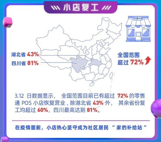阿里巴巴零售通分布在全國的13萬臺POS數據顯示,截至3月12號,全國范圍內目前已有超過72% 的零售通POS小店恢復營業, 除湖北省43%外,其余省份復工率均超過60%,四川以高達81%的復工率暫居全國第一。