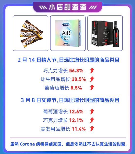 情人節、女神節期間,小店“狗糧”類商品均出現增長。2月14日情人節,日環比增長明顯的商品類目包括:巧克力增長56.8%,計生用品增長20.5%,葡萄酒增長8.5%。
