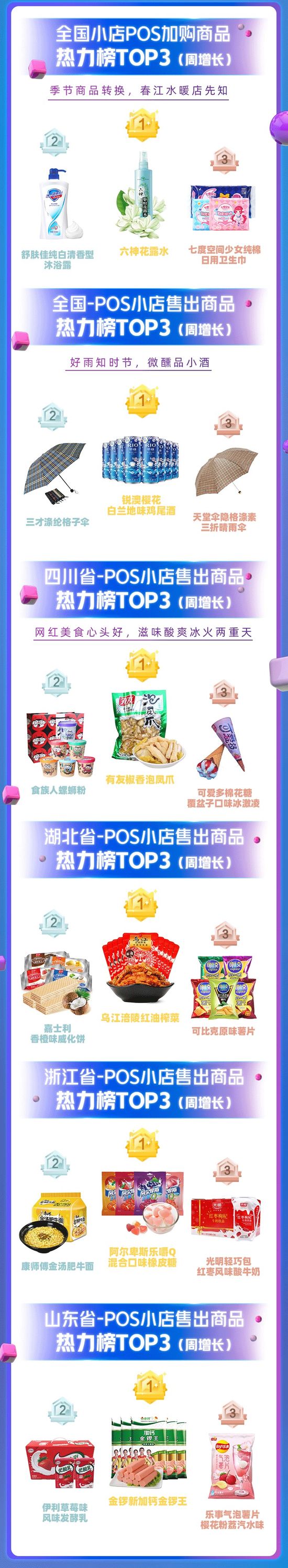 通過零售通數據可以看到,四川人依舊瘋狂購買著辣味食品,泡椒鳳爪、螺獅粉備受青睞;Q彈果味糖成為浙江小店的寵兒;山東人的美食搭配令人捉摸不透:火腿腸、發酵乳加薯片;宅家抗疫的湖北人民,泡菜就餅干。