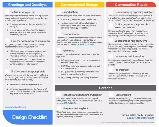 最后附上 Google 對于語音/對話式交互的 Design Checklist,總結得也算比較完全了,供有相關工作場景的小伙伴們參考~