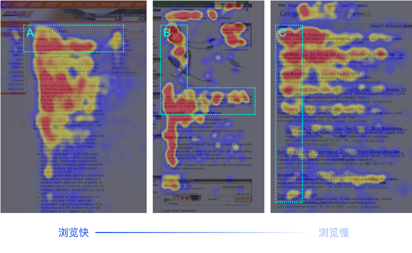 通過對不同用戶眼部追蹤的實驗數(shù)據(jù)收集、分析,得出訪問者通常會沿著集中典型的模式瀏覽頁面: