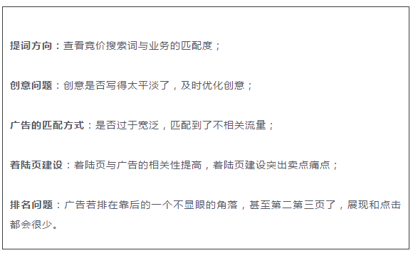 這一類型的廣告,點擊率很低,轉化率也很低。可以簡單理解為很少人點廣告,就算點了廣告,也很少人咨詢,沒有轉化。說明廣告沒有很好的展現到目標人群面前,或者廣告創意吸引力不夠。另外在網站層級也可能出現問題。因此,其優化方向,既要思考如何優化廣告的創意,以及排名曝光,來提高點擊率。還要關注流量的匹配情況,優化精準度。