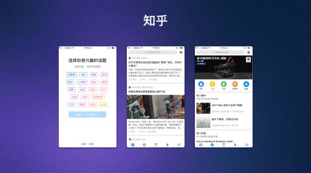 知乎的Logo是藍色,代表了高科技、智能、可靠(開課吧也是藍色)。特別在首頁,用黑白灰表現出簡潔、質感,讓內容沉淀在頁面里。這樣就很好地表現出這款產品的定位:高品質內容問答社區。