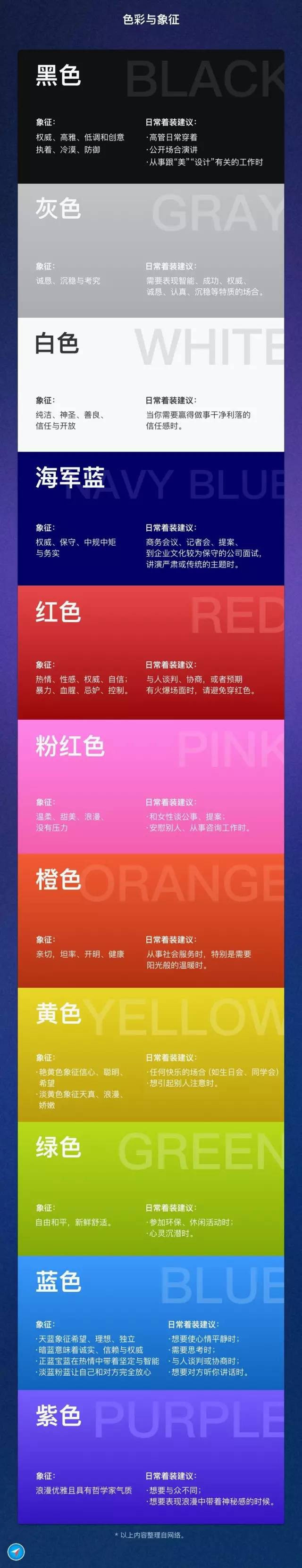 現在,我們就來看看目前公認的,每種色彩的象征意義(下次約會,你想好穿什么顏色的衣服了嗎?)。