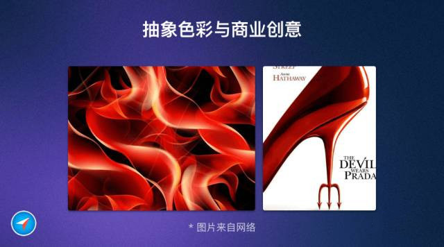 我們看左邊的火焰,圖片用艷麗的紅、黃、黑和流線的形態,表現出燃燒的澎湃與焦灼,傳達出活力、自信、神秘的感覺。