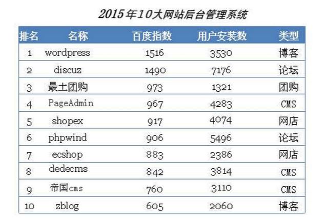 我們在制作網站時候基本都會去下載網站后臺管理系統來用,這為我們節省了很多開發程序的時間和成本,但是大大小小的網站系統很多,我們需要反復權衡,功 能、執行效率、安全性、后續升級服務都是要考慮的關鍵要素。我們根據百度指數和萬網提供的主機安裝數據,特別發布十大網站后臺管理系統排行榜,能較大程度上反應網站系統的受歡迎程度。