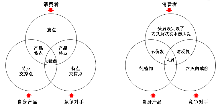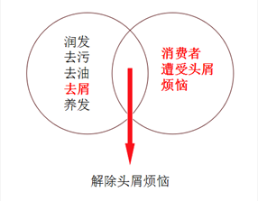 如右上圖,自身產品與競品都具有去屑功效,消費者的痛點仍然是頭屑困擾,我們稱之為“原生痛點”,但解決頭屑問題的同時,又衍生出諸如頭屑沒完沒了,常反復,去頭屑的洗發水傷頭發等痛點,我們稱之為“次生痛點”,產品所具有的特點就是解決次生痛點的唯一有效途徑,這樣,去屑的產品功效點與不傷發的產品特點的結合點“去屑不傷發”,就形成了產品的差異化賣點,與競品的“去屑防反復”的賣點,形成了有效市場區隔,滿足了遭受傷發困擾的細分人群的去屑需求。