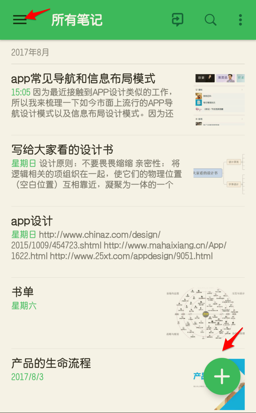 其中,舵式導航中蘊含二級導航標簽的標簽可以單獨成為一種導航——點聚導航,適用于因為內容的展示,要求界面有極高的簡潔性的APP。印象筆記的APP版本就是一個典型的點聚導航,印象筆記是個特別的例子,不僅用點聚導航作為一級導航,還用了抽屜導航作為二級導航,應該是為了大程度保持產品的簡潔性。