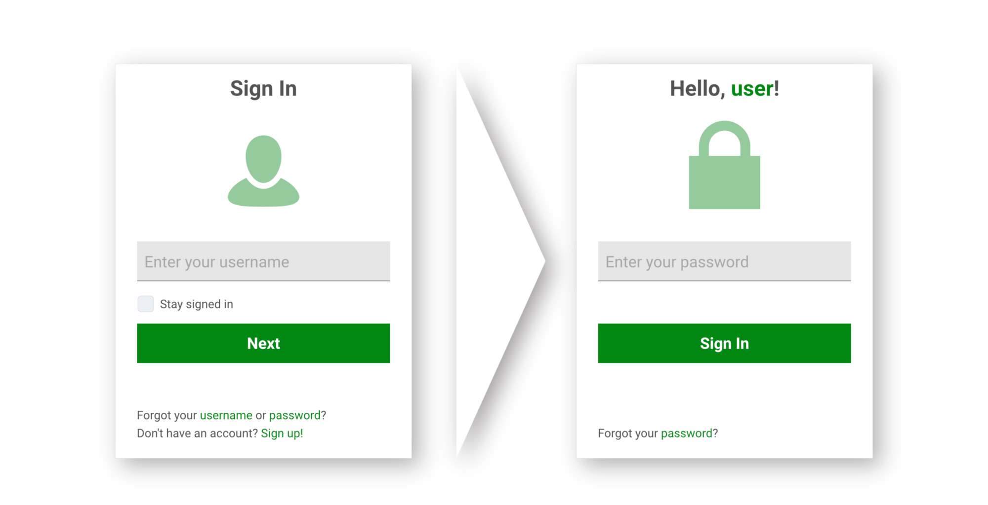 如果用戶必須在一屏上輸入帳號/郵件,在另外一屏上輸入密碼,那么設計師應該參考 Yahoo 和 Gmail 的設計,讓兩屏看起來不一樣。只是將“用戶名”/“郵件”標簽替換為“密碼”是遠不夠的,因為兩屏整體看起來幾乎是完全一樣的。