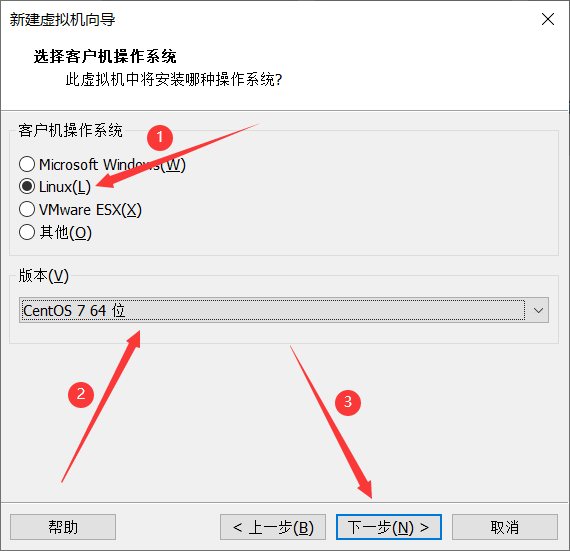 4、操作系統類型選擇“Linux”,版本選擇“CentOS 7 64位”,下一步: