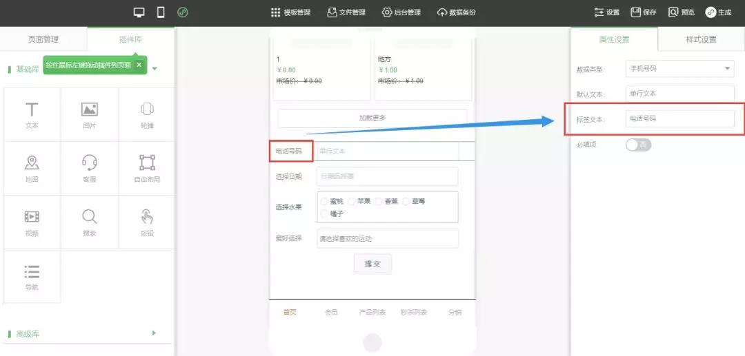 在樣式設置中選擇樣式,并在全局設置中設置寬度等,并在屬性設置中填寫標簽文本的名稱(注:該樣式需要手動調整組件的寬、高等達到展示效果)
