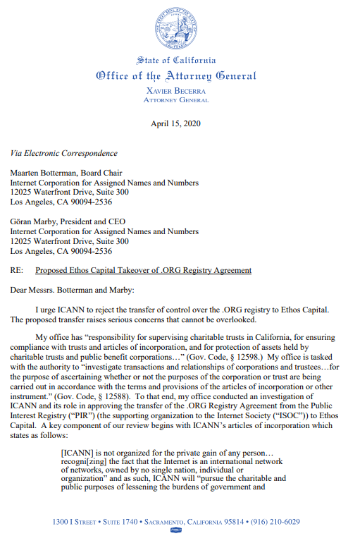 Becerra 在信中補充道:若允許 Ethos Capital 收購 PIR,那 ICANN 將失去作為注冊管理機構所重視的獨特特征,而該公司將因此從數以百萬計的非盈利和非商業組織那里獲利。