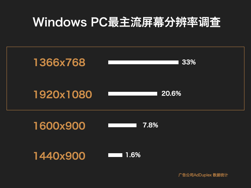 (來自:廣告公司AdDuplex 大數據顯示(最主流的PC屏幕分辨率依然是1366×768,而Win10系統下依然有近34%的設備保持這個分辨率,只有27%以上的PC在全高清或者更高級別)http://diy.pconline.com.cn/886/8861940.html)