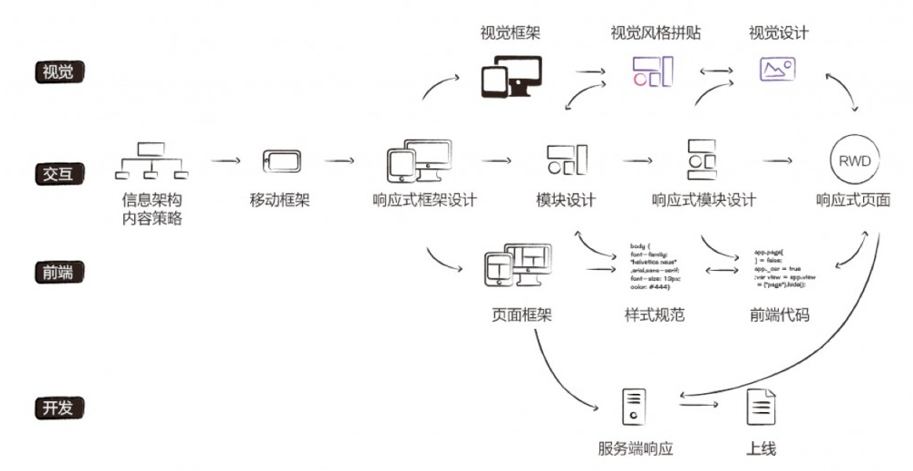 響應(yīng)式設(shè)計之所以叫響應(yīng)式“設(shè)計”而不叫響應(yīng)式“技術(shù)”,是因為它是一項設(shè)計先行的工作。需要設(shè)計先明確好響應(yīng)方式再實現(xiàn)出來,不能出一套設(shè)計稿后等著前端看情況把它變成響應(yīng)式網(wǎng)頁。所以整個流程最初從交互階段開始,分成6個主要步驟,視覺、前端、開發(fā)等角色根據(jù)情況盡早介入。