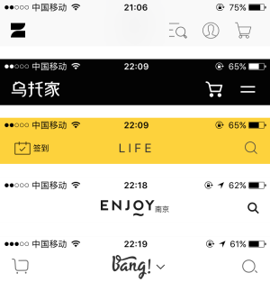 每個應用都有一個標題欄,這成了App的標準設計了。標題欄上一般會有三個重要的元素組成:logo圖形或者文字、搜索頁的入口、購物車的圖標。