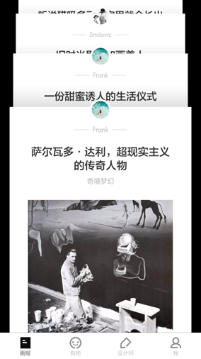 Tab標簽欄如果類別比較多的時候采用橫滑的設計形式。如果應用的頻道比較少,例如造作應用(圖1-7),甚至可以直接把標簽欄設計在底部,相當于整個底部標簽欄的作用,當然底部標簽欄重要的“我的”模塊,入口放置在頂部標題欄上。