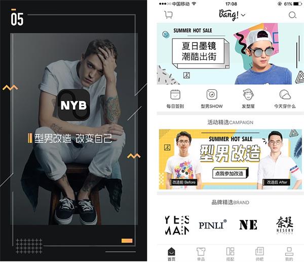 下半部分Banner采用了176*176PX(1:1)的小圖。這樣圖片比例符合之前分析的專題圖適合16:9,商品圖適合用1:1。這樣的大小比例看起來可以讓版塊之前區分的很清楚。當然如果下半部分圖片一定要使用小圖,否則看起來層次就混亂,。例如男衣邦的首頁,上圖和下圖的比例看起來非常的接近。模塊層次區分的就不是非常好。