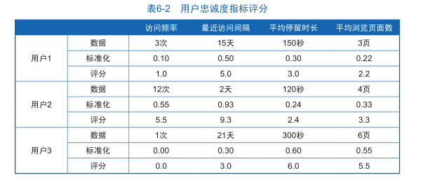 表6-2中,用戶忠誠度的4個分析指標經過標準化處理后統一以10分制的形式輸出,這樣就能直接區分每個用戶的每項指標的表現好壞。基于每個指標的評分,可以對用戶進行篩選,比如營銷部門重點跟進經常訪問網站的用戶,可以選擇訪問頻率評分大于3分的用戶,或者重點跟進用戶訪問參與度較高的用戶,可以篩選平均停留時間和平均訪問頁面數都大于3分的用戶,這樣能夠幫助營銷部門迅速定位忠誠用戶。