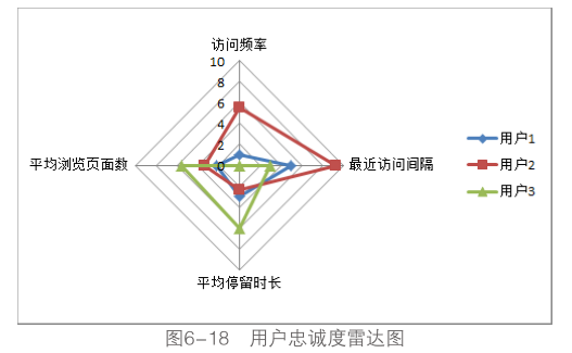 圖6-18使用了表6-2中三位用戶的評分數據繪制而成,能夠非常形象地表現用戶忠誠度在各指標上的表現情況,用戶1的整體忠誠度較低,用戶2在訪問頻率和訪問間隔具有較好表現,而用戶aki訪問具有相對較高的參與度。使用雷達圖分析用戶的忠誠度主要有如下優勢: