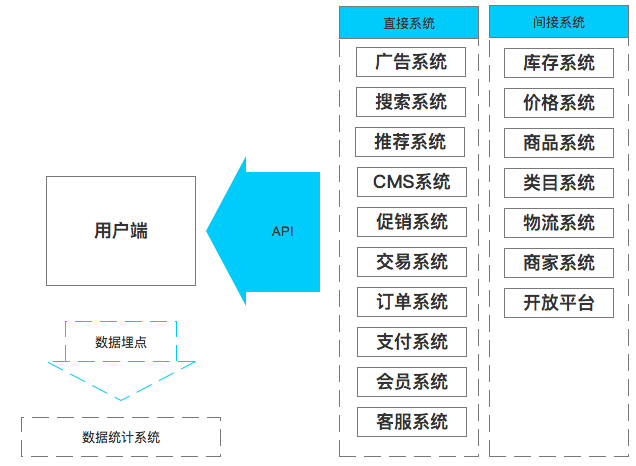 在整個電商系統體系里面。用戶端需要面對眾多系統,而這些系統的數據又相互依存,他們之間通過API進行傳輸對接。