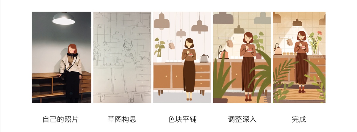 主題:《休憩時光》的主題源于我的日常生活記錄,在亦師亦友的司徒大大家里,當時覺得柜子很喜歡,攝影師lenfer給我拍了這張照片。后來翻照片時,覺得吊燈圓圓的也很可愛,一下就有了在廚房里吃著小甜點的畫面,于是做了草圖構思。照片里的柜子是放在客廳,所以背景是空的。但是畫的設計是廚房吃甜點,所以廚房的道具陳設是找了其他的真實的參考圖,以及自己想象。
