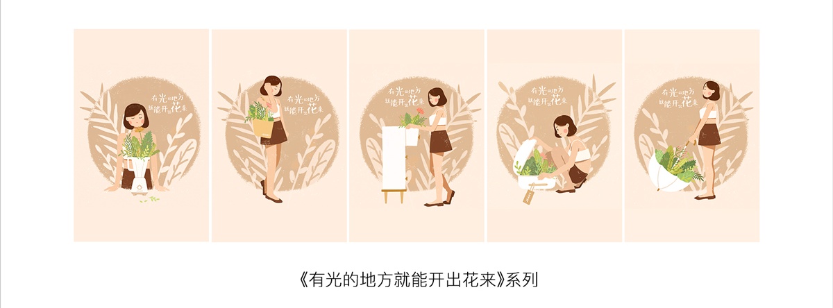 《SEA YOU》:水+人物,把水設計出相框的樣式,就可以和人物結合在一起了。《有光的地方就能開出花來》系列:花通常都是養在瓶子等容器里,把花放在其他不常用的容器里,可以產生一點不同的感覺。