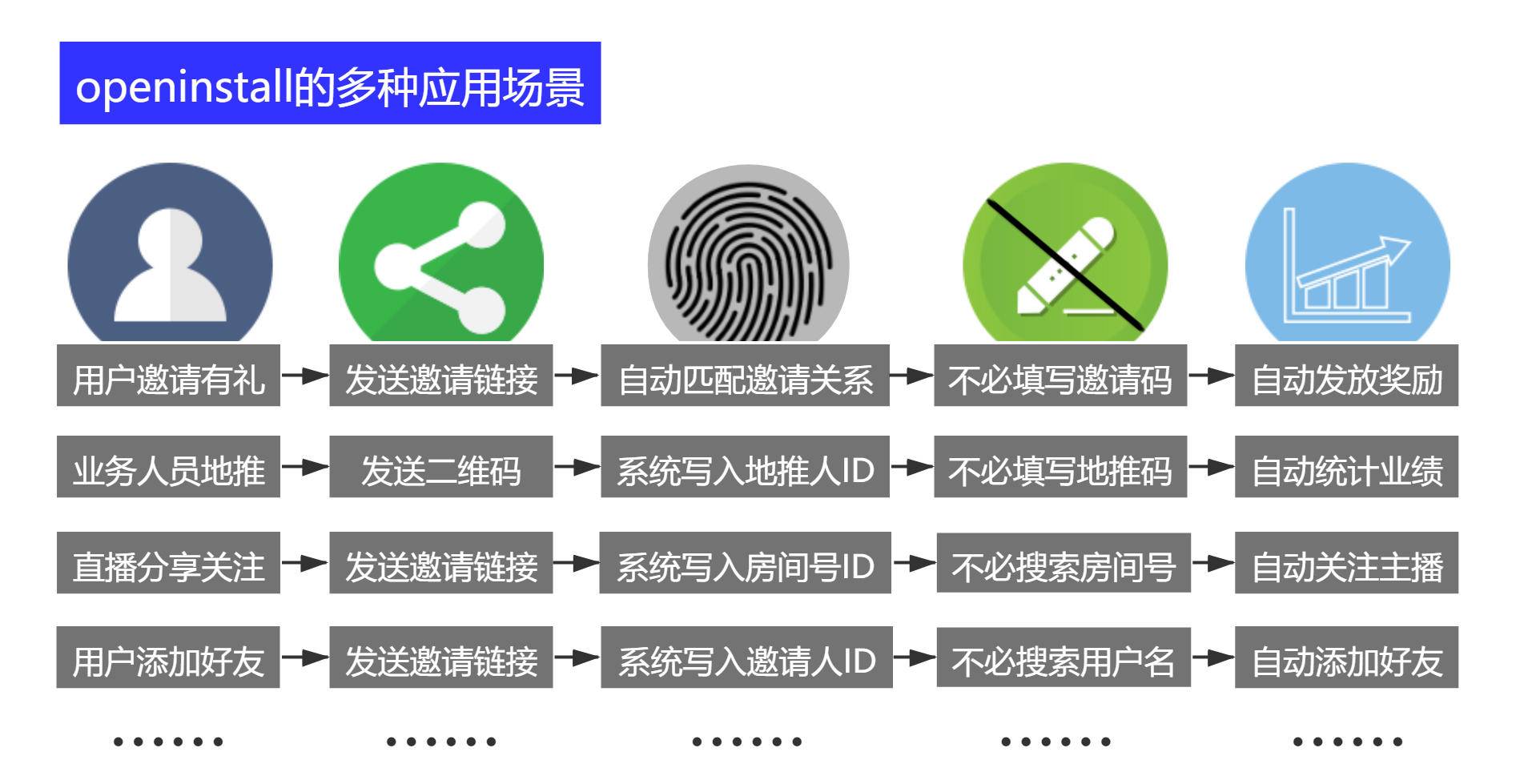 淘客類App的分銷獲客、酒店餐飲類App會員制邀請、生活工具類App的用戶分享......都能有效追蹤來源。這是一項通用技術,幾乎任何類型的App都可以在營銷場景或優化流程上找到相應的用途。