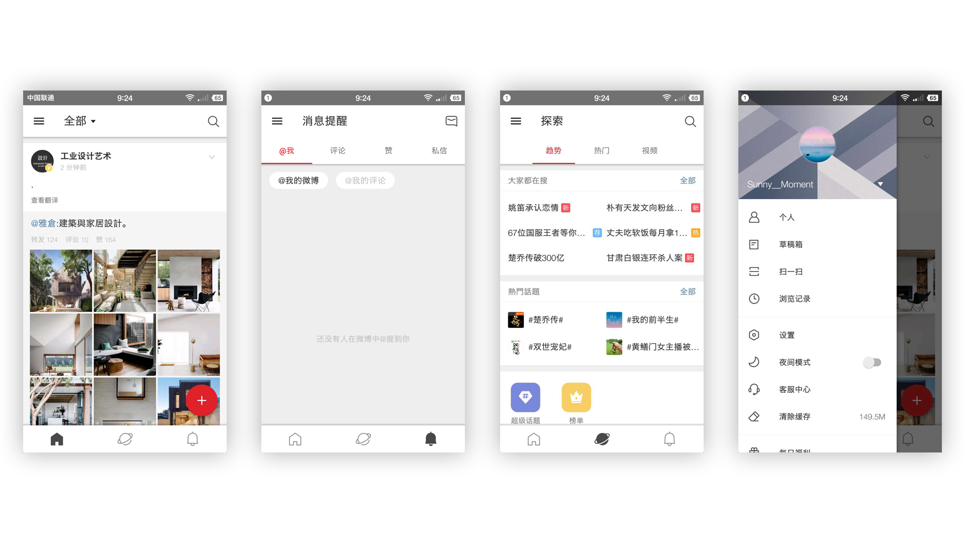 微博國際版的推出利用簡潔、“性冷淡”風(fēng)格留住底層微博用戶以及戰(zhàn)略趨向國際化,不考慮國際戰(zhàn)略,這個(gè)高端用戶按我的理解是愛刷微博以及分享微博用戶,因?yàn)槲⒉┩ㄓ冒鎯?nèi)容太過龐雜,充斥著各種廣告,這是想看到自己關(guān)注博主微博的用戶是不能忍受的。兩個(gè)微博版同樣四個(gè)主要頁面。