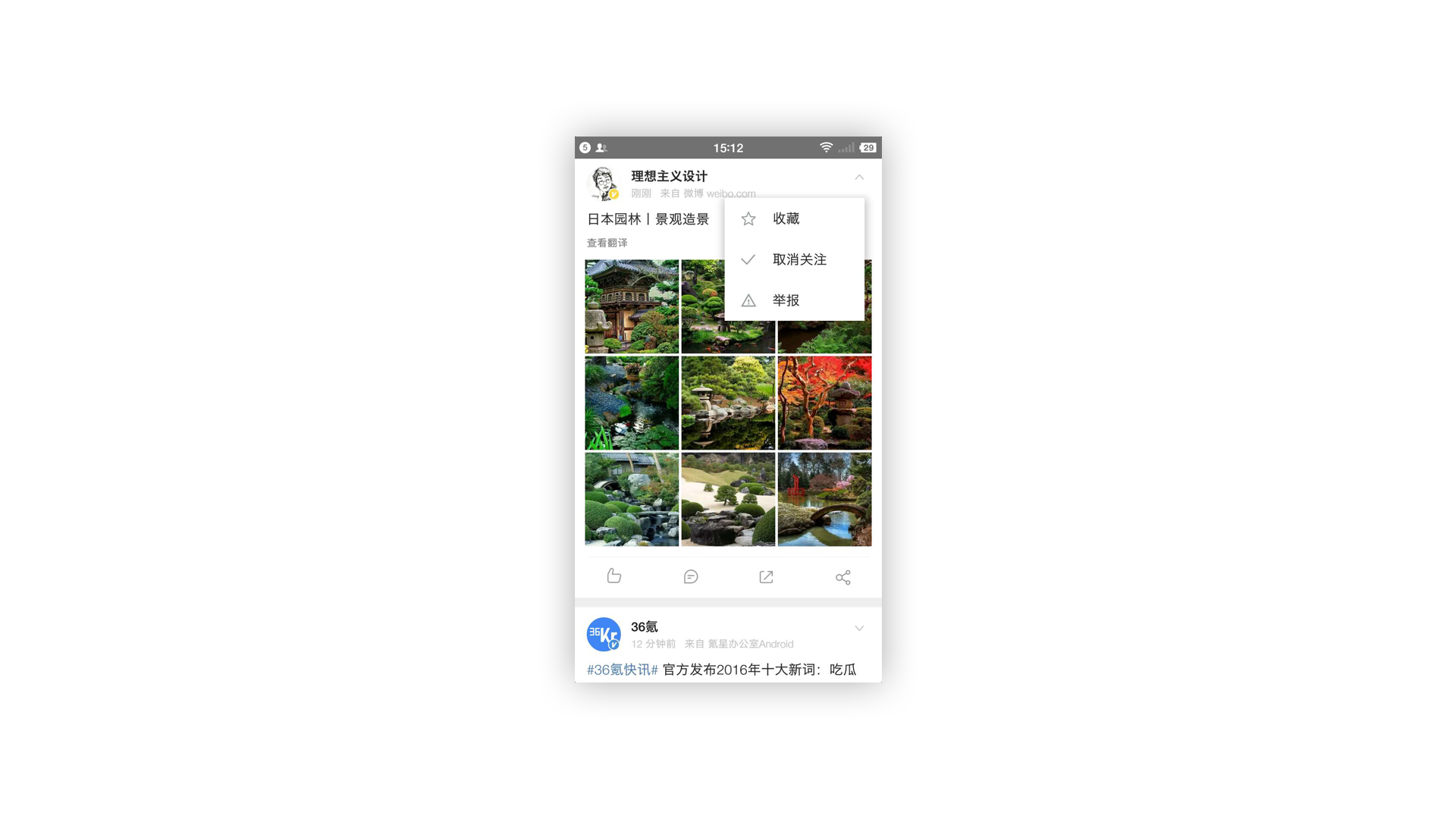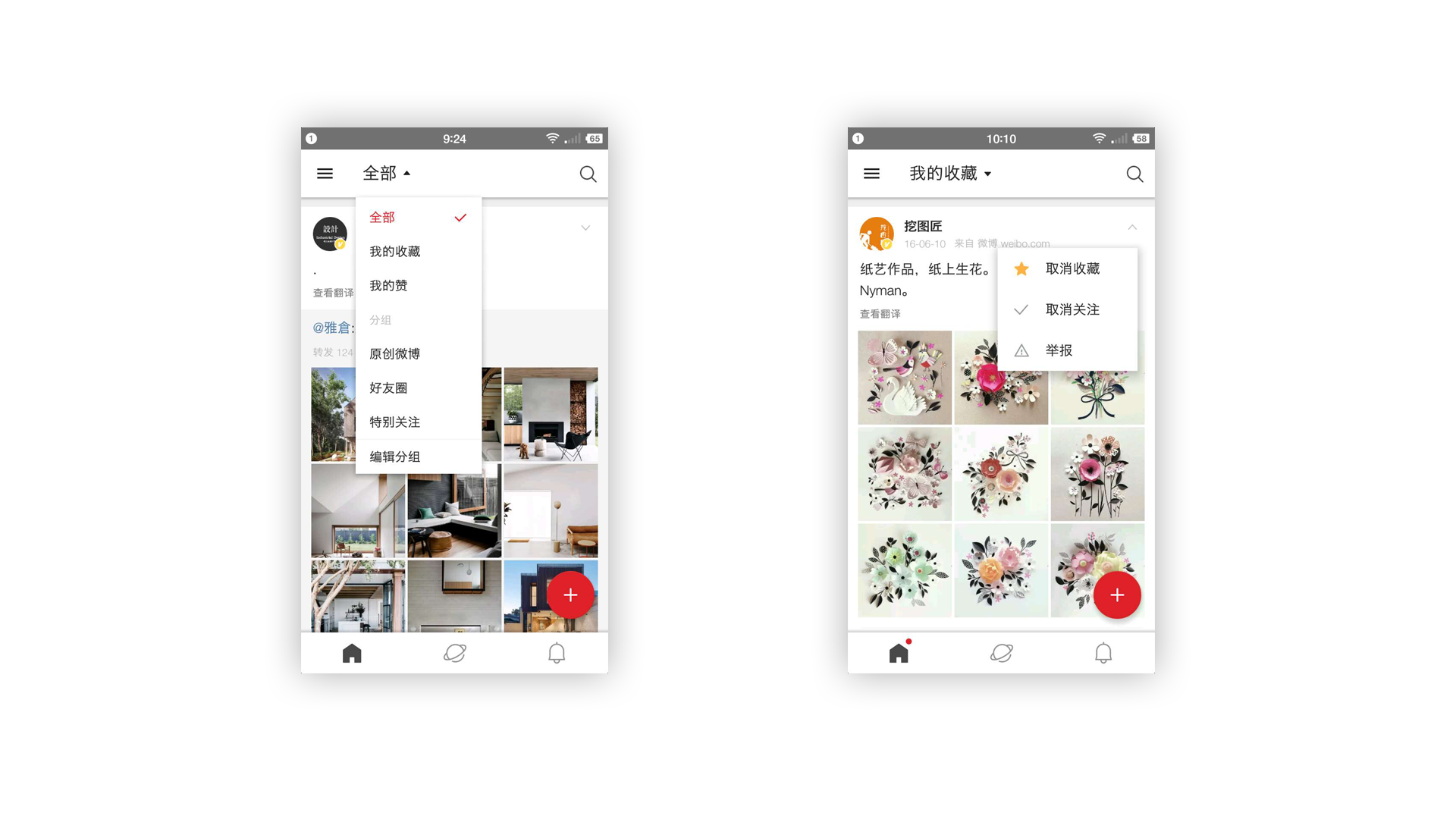 用戶場景:用戶在看到一條比較有用的微博,比如是一條設(shè)計(jì)干貨分享文章,用戶收藏此微博以方便以后可以用到微博內(nèi)容和查看,但是一旦用戶收藏的微博數(shù)量過多,用戶為此還需要不停翻找到需要找到的微博