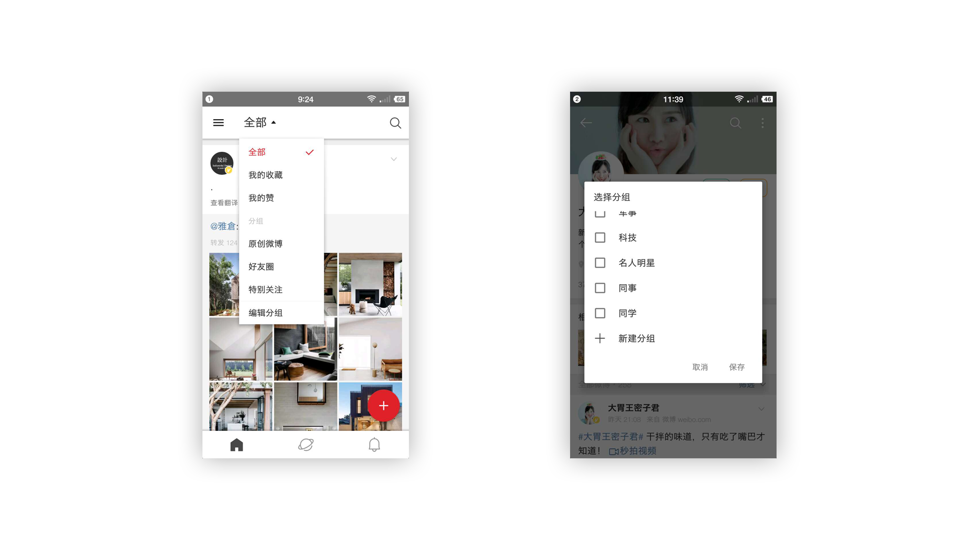 思考:用戶場景中在關(guān)注需新建分組問題,應(yīng)多加個(gè)新建分組功能放右上角;對分組順序的調(diào)整功能,不應(yīng)只有刪除分組、新建分組和對分組成員編輯,分組解決了一旦關(guān)注的博主數(shù)量過多無法全部瀏覽,解決了一定的timeline問題,用戶可直接挑選到其想看的內(nèi)容