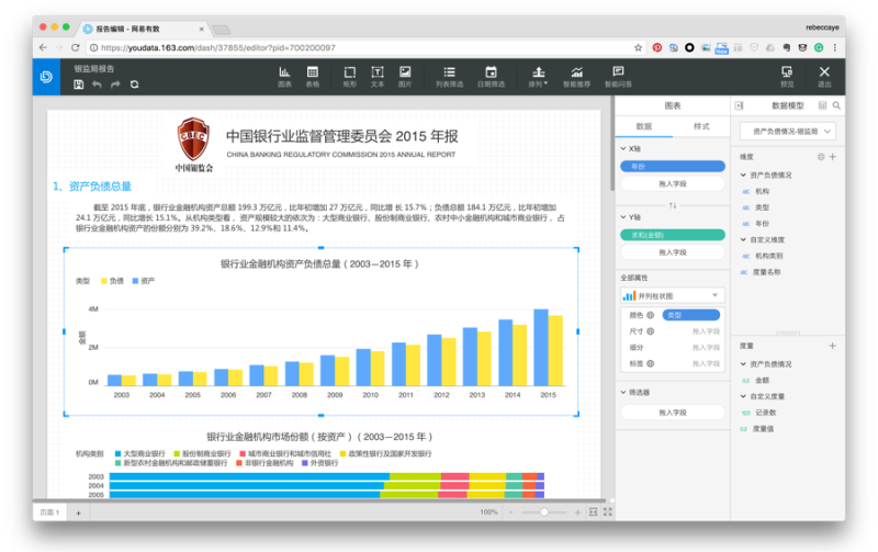△ 有數3.0版報告編輯界面,用戶可以在當前頁面制作圖表并完成整個報告的制作,而不需要在不同模塊之間跳轉