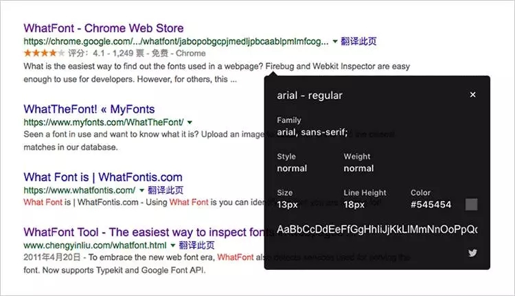 網頁上的字體識別最為簡單,我們只需要找到瀏覽器調用的字體文件的名稱就可以了,很多瀏覽器都提供了代碼檢查的模式來找到我們想要的字體信息,當然這個功能一般來說是提供給前端開發使用,對于設計師們來說不太友好。不過好在有各種 “哪里不會點哪里” 的瀏覽器插件,普通用戶也可以方便地知道網頁上使用的字體。