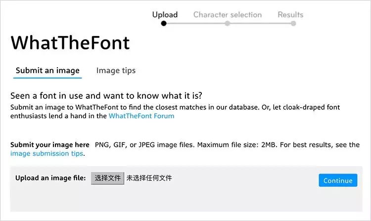 設計師經常碰到的一個場景是,搜集到一些很贊設計作品,進而想知道圖片中所使用的字體。這種情況下我們就可以使用一些通過上傳圖片來進行字體識別的服務。提供識別圖片中的西文字體的網站較多,有大名鼎鼎的在線商業字體銷售平臺 MyFonts 旗下的 WhatTheFont;也有高質量免費西文字體下載網站 Font Squirrel 提供的Font Identifier 以及 WhatFontis 等。