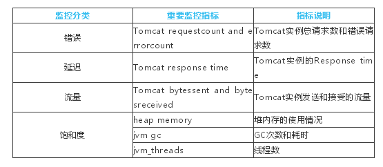 通過對黑盒、白盒監控的理解,結合監控的四個黃金指標,針對Tomcat的重要監控指標,可以從以下幾個方面進行考慮: