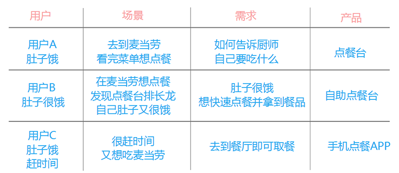 用戶的需求從如何點餐、快速點餐到快速取餐,對應的服務也從人工點餐、自助點餐到手機APP點餐。從麥當勞點餐方式的演變可以知道,一款產品是從用戶使用場景所提取的需求中誕生的。