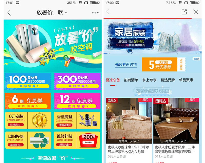 商品打折是電商APP常見的活動形式,運營人員在做活動的時候,常常會根據日期,策劃對應的活動,七月正是酷暑難耐的時候,國美電器APP推出“家居家裝,夏涼用品5折購買”,蘇寧電器APP則是根據放暑價這一時間,推出“放暑價”,領取降暑優惠券活動。