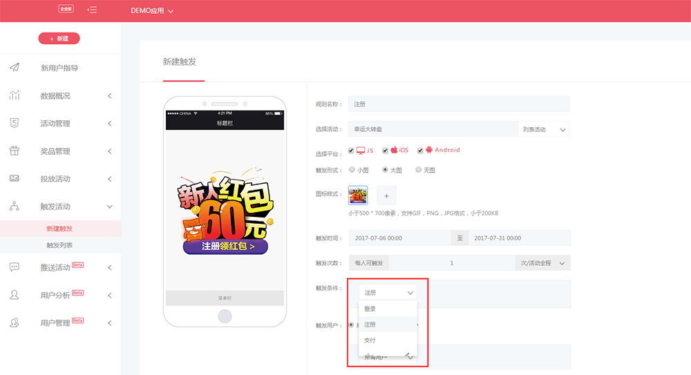 小編這一APP活動運營工具就可以根據用戶的使用場景觸發對應的活動,對用戶進行精準營銷。