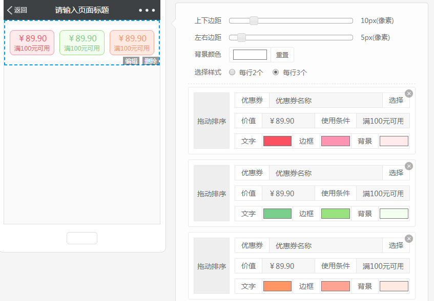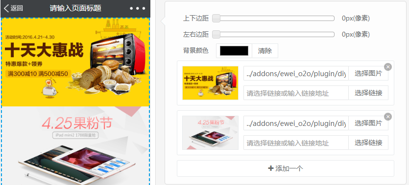 比如輪播圖我們選擇幾張的,三張的還是四張的;選擇樣式之后要配置具體的信息:我們要上傳圖片,然后為圖片設(shè)置鏈接。這些組件點擊可以跳轉(zhuǎn)到別的頁面,而不同組件需要配置的信息也是不同的,取決于組件本身。