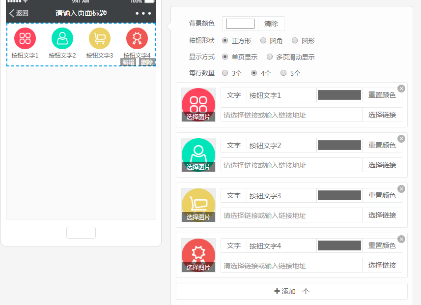 按鈕組主要應(yīng)用于主要頁面,比如首頁輪播圖下方,可以是多個分類的入口,也可以是分模塊的入口;給每個按鈕定義文字,上傳圖標(biāo),然后設(shè)置跳轉(zhuǎn)鏈接,可以設(shè)置多行。
