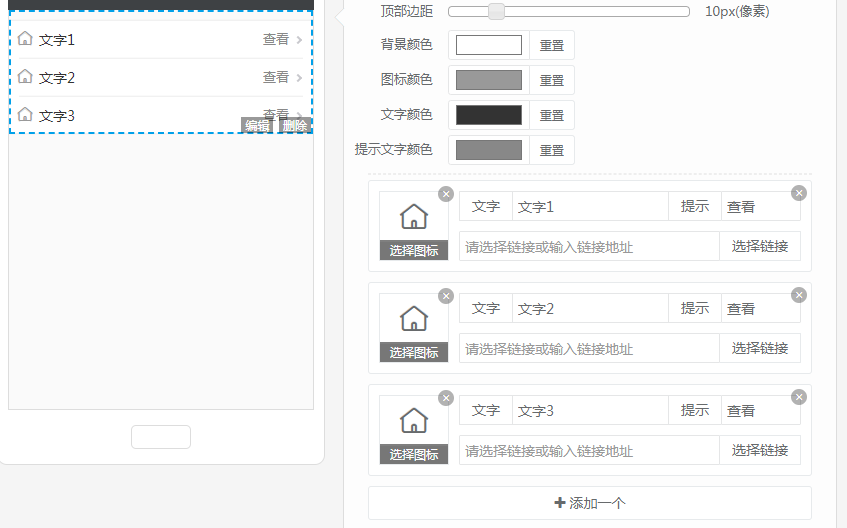 列表導(dǎo)航大多數(shù)情況下用在個人中心的頁面,是許多功能的入口,需要編輯列表標(biāo)題、鏈接地址??梢蕴砑佣鄠€多個列表;也可以選擇不同的樣式,比如加不加圖標(biāo),加不加“查看”提示文字。