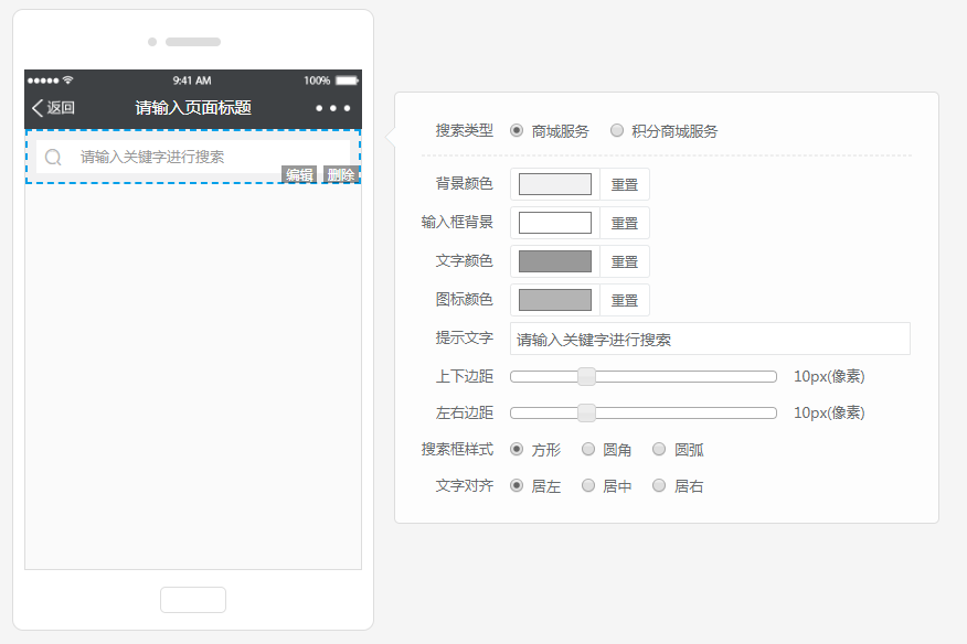搜索欄與頂部搜索欄類似,不同點是頂部搜索欄是固定在頂部的,而搜索欄的位置是不固定的,可以自由地放位置。同樣,關(guān)于搜索頁面以及搜索結(jié)果頁面都需要提前定義好。